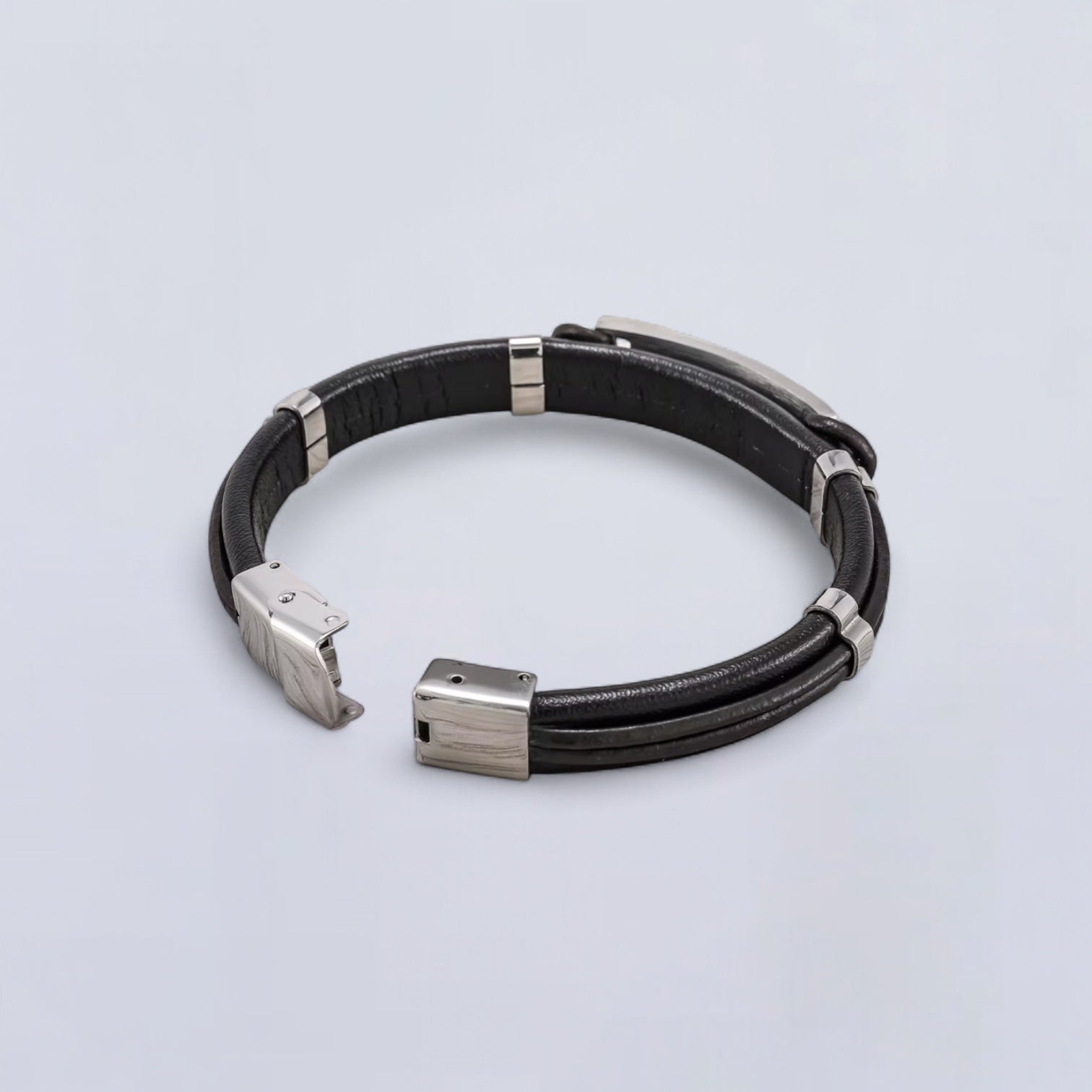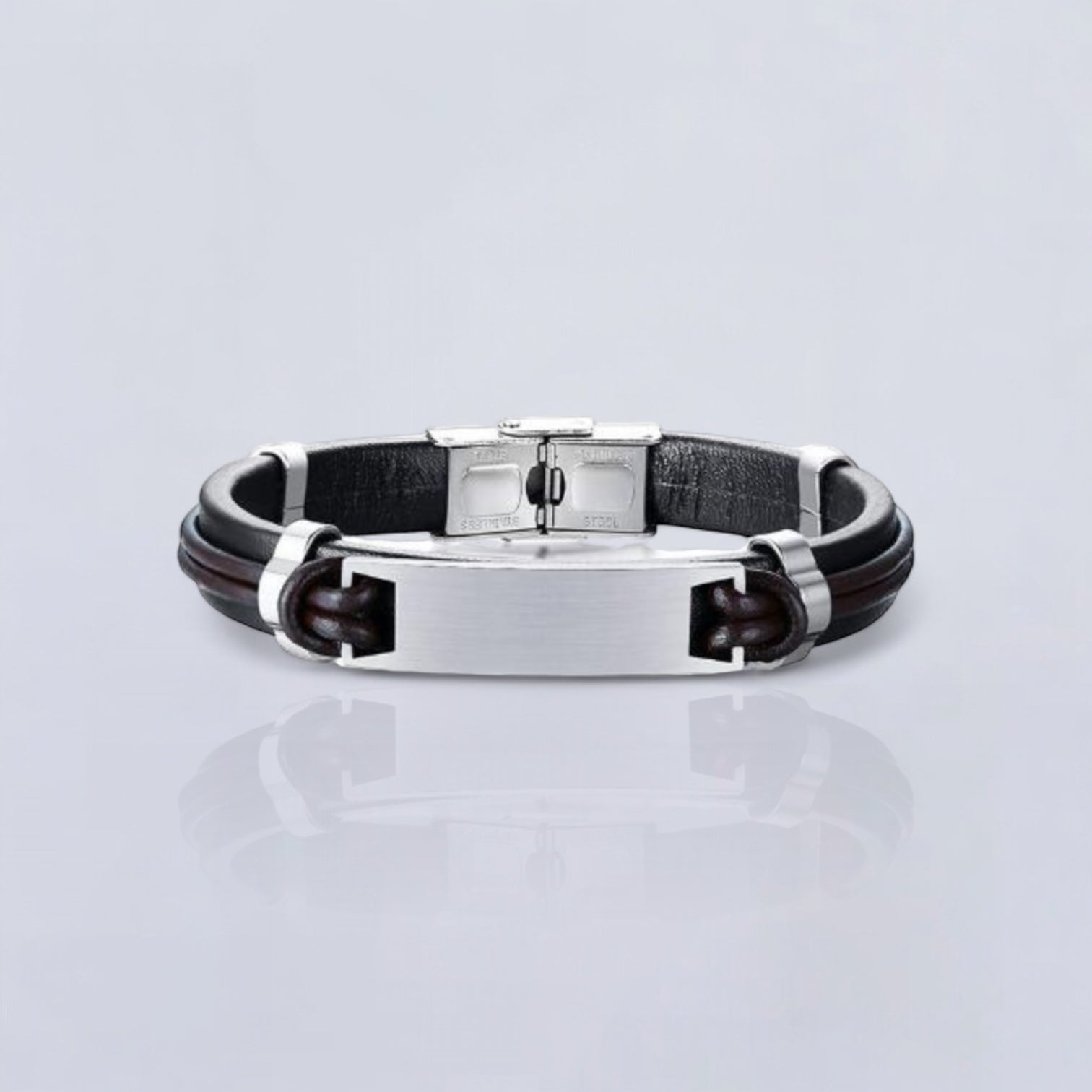Esta pulsera de cuero para hombres combina resistencia y estilo con su diseño sencillo en acero inoxidable. Personalízala con un logotipo grabado gratis, haciendo cada pieza única y audaz. Perfecta para quienes buscan un accesorio que destaque sin esfuerzo.